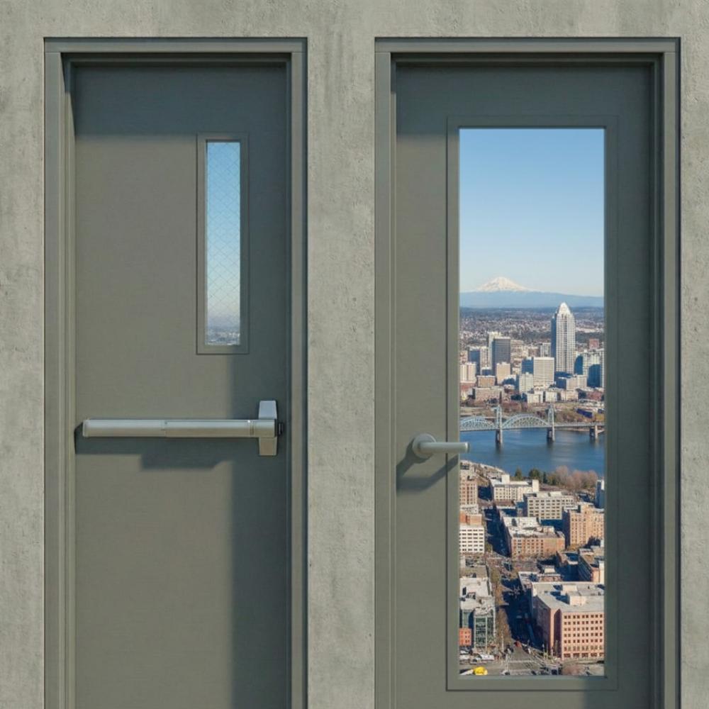 Flush hollow metal doors offer a smooth face on either side. Their lack of windows makes them a budget-friendly option. These are the most common in commercial applications and can be found at stair and hallway entries. With proper core material, they become 3-hour fire rated.
